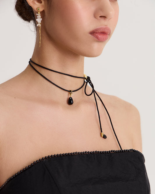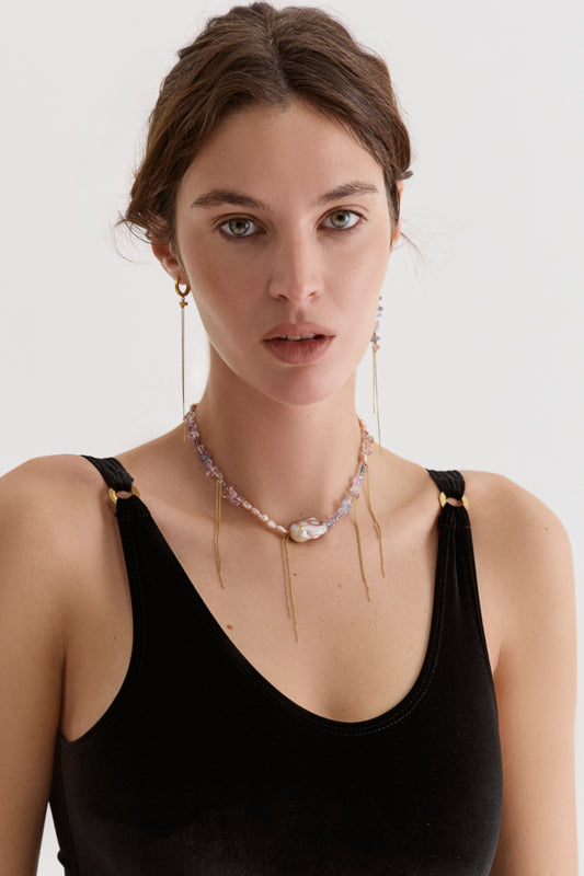The Éna necklace embodies harmony and natural beauty born of the sea. Its minimalist form is filled with quiet energy: soft grey river pearls create a gentle, wave-like texture, while the central baroque pearl with its pearlescent glow reflects light like the first spark of sunrise on the water.