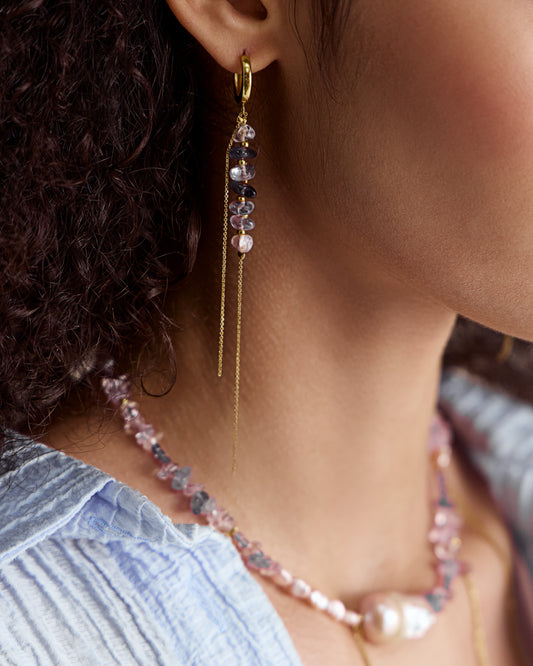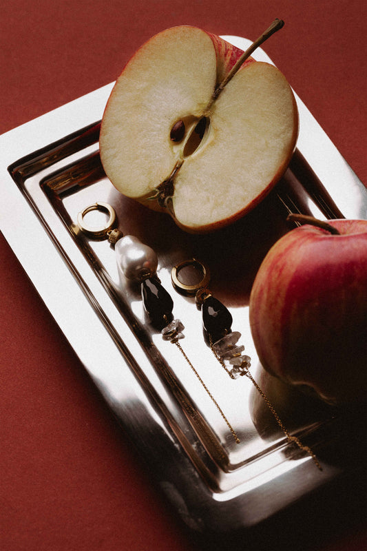 The Éna earrings are an asymmetrical pair that unites natural imperfection and refined elegance — as if shaped by the sea itself.