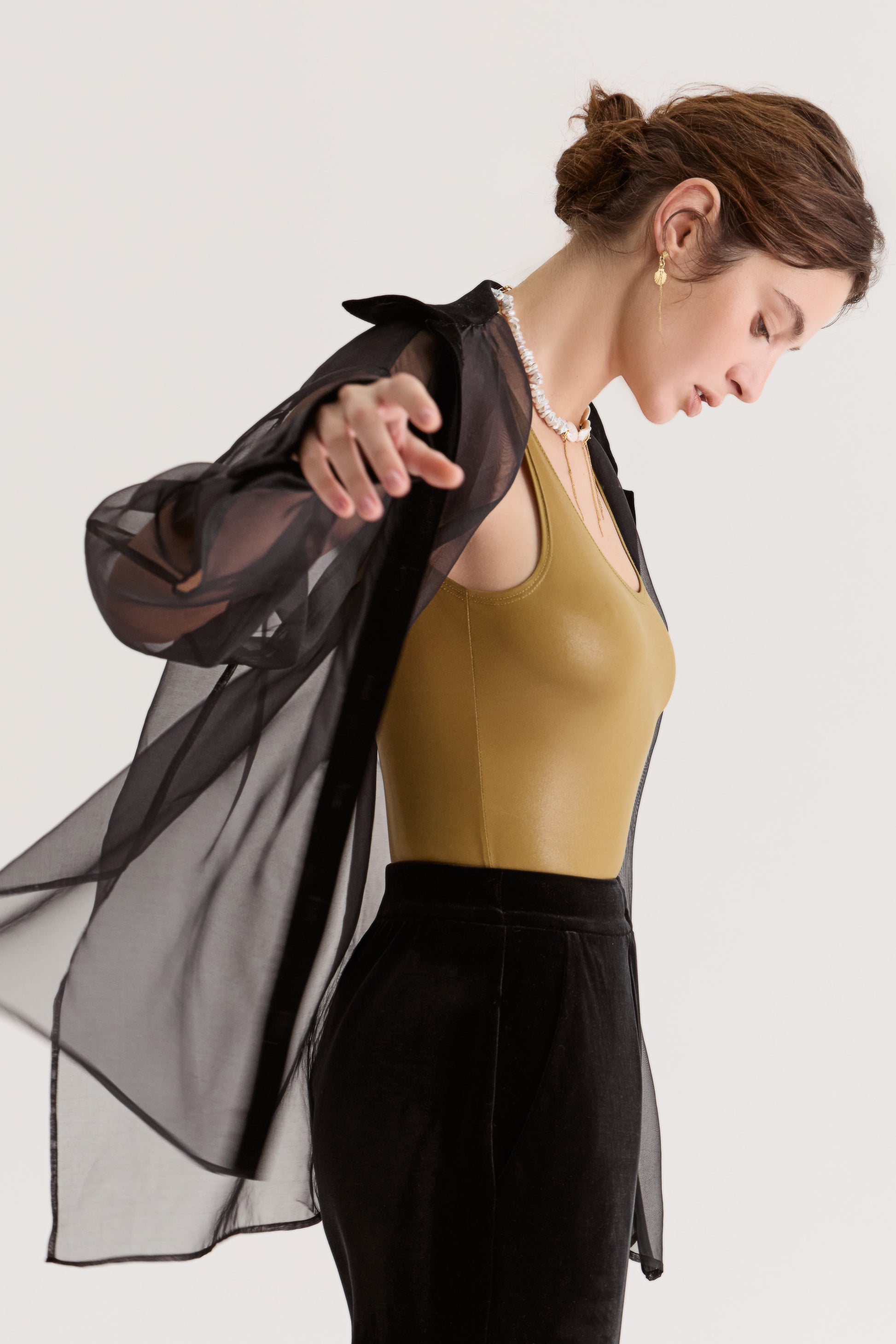 Elegant bodysuit Éna with a deep round neckline at the front and back — a timeless wardrobe essential that combines comfort and sophistication.