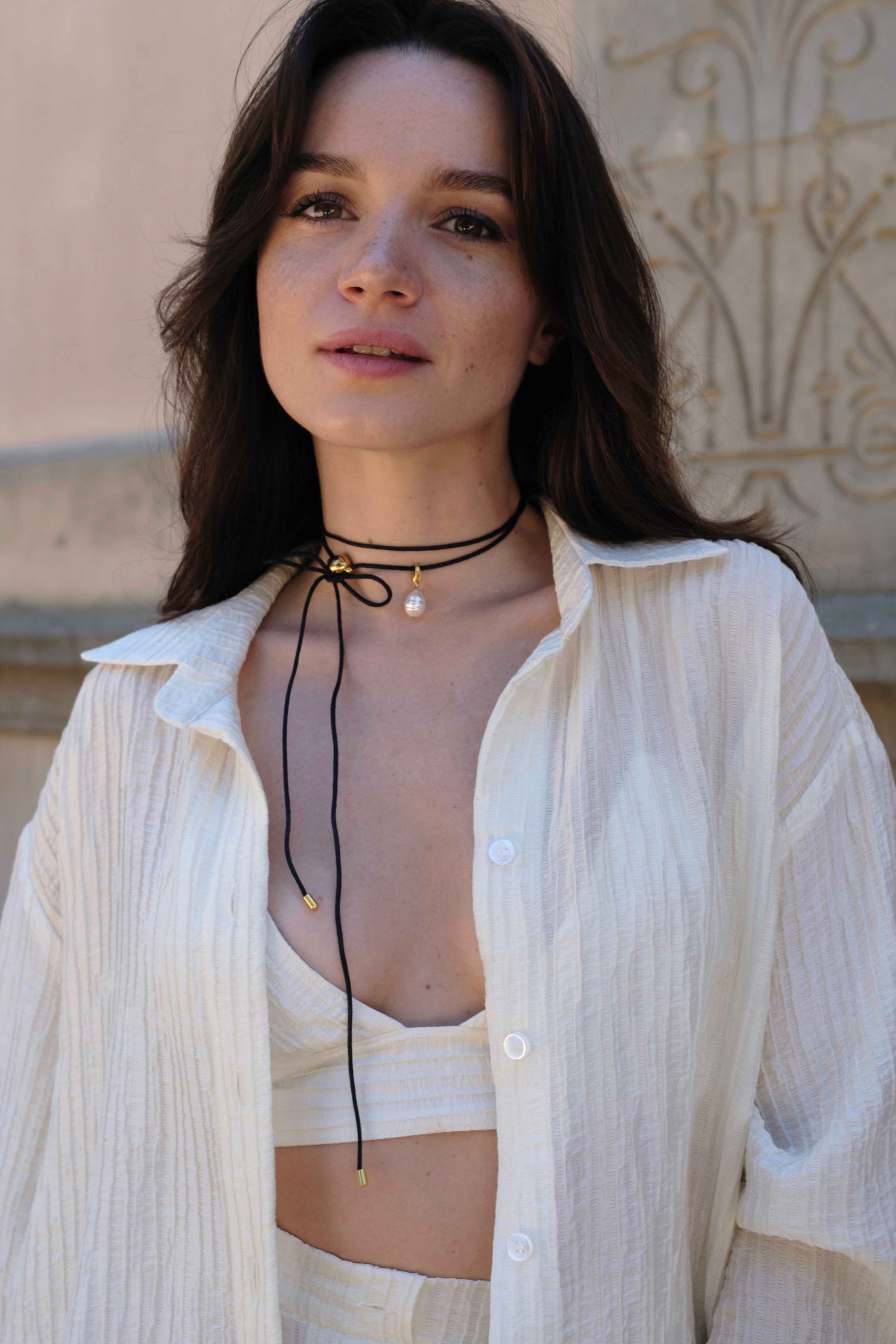 This handcrafted choker features a black cord with gold-plated tips, secured with a magnetic clasp for effortless wear. A natural river pearl, delicately set on a gold-plated carabiner, adds a refined and sophisticated accent. A versatile piece that complements any look, from casual to evening wear.