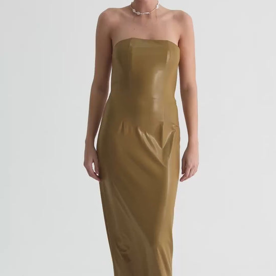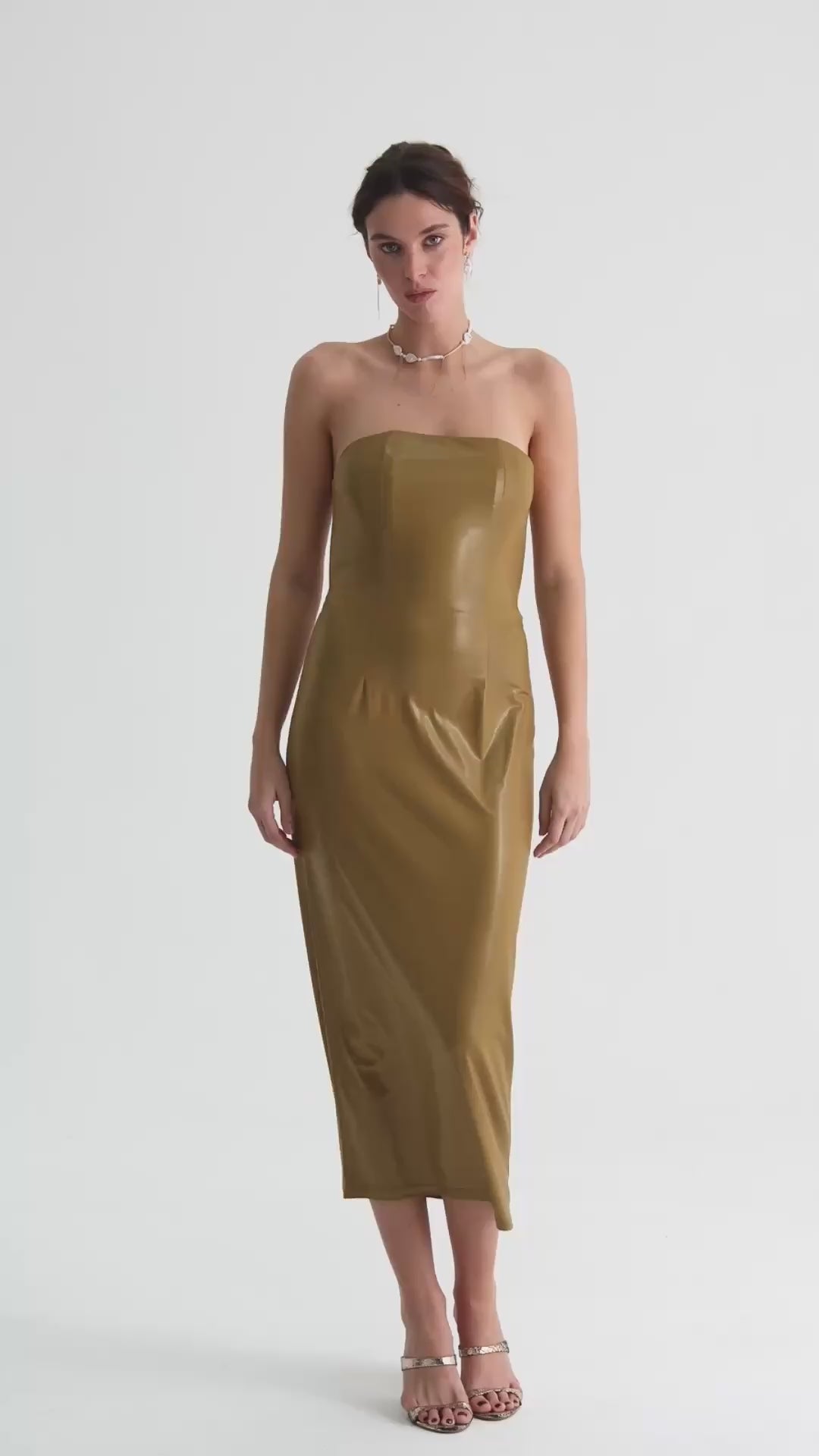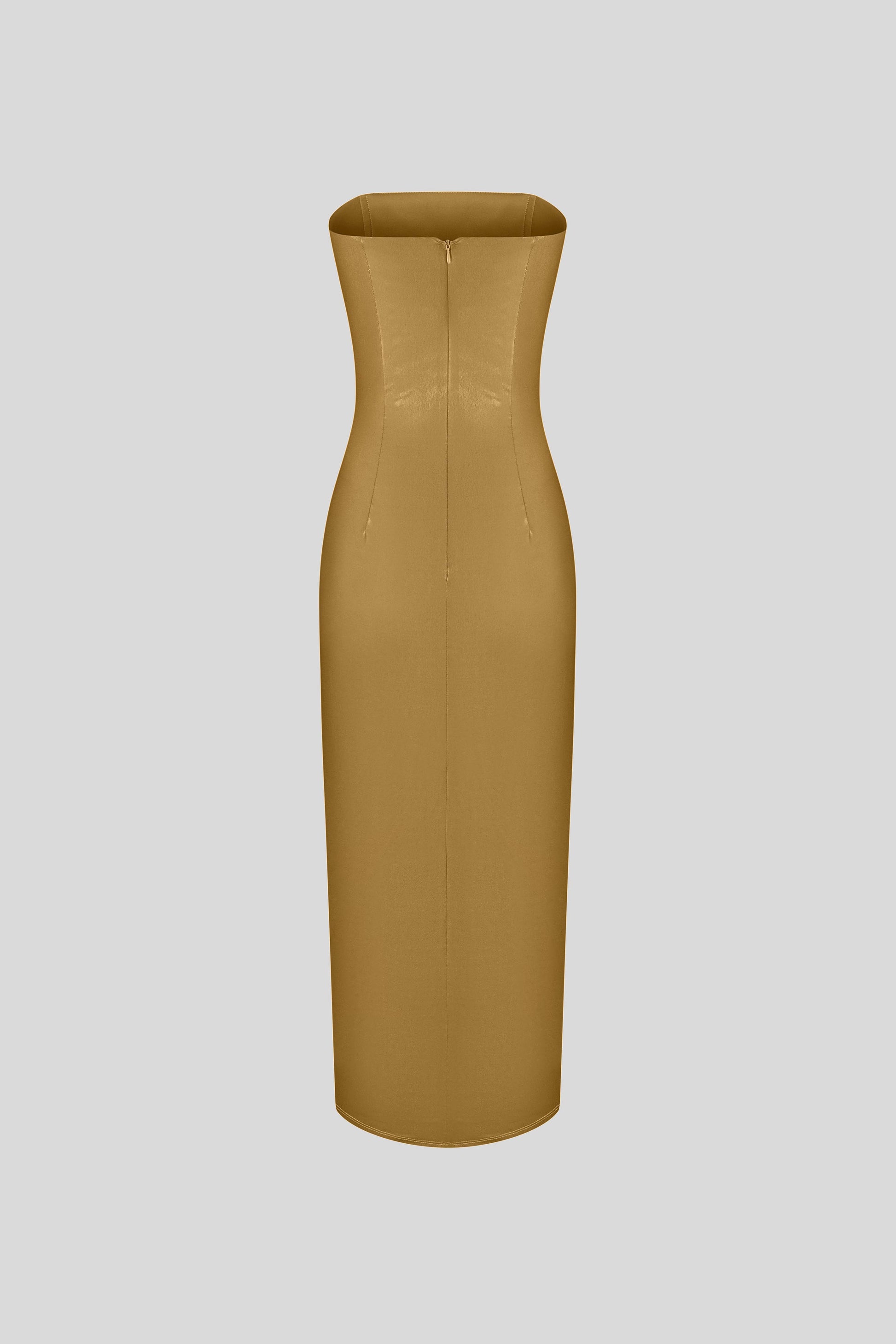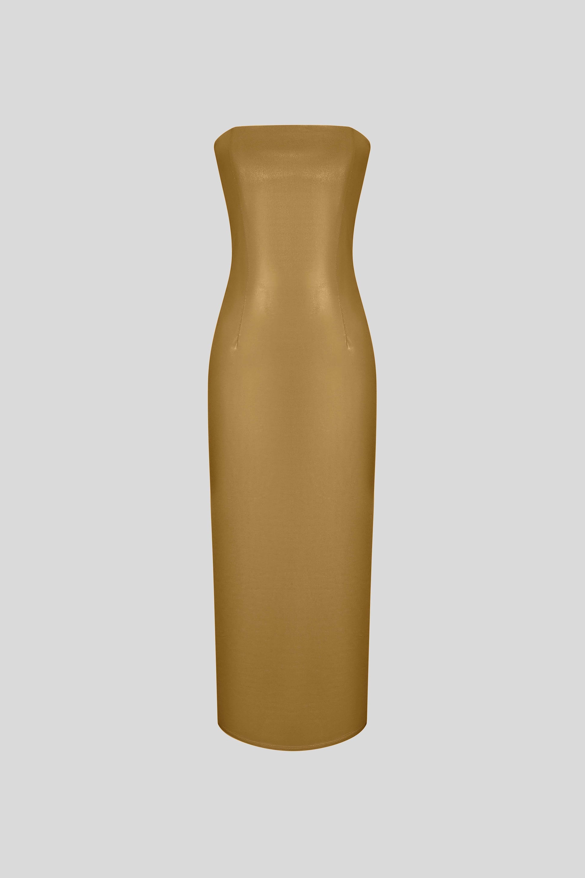 Elegant Éna maxi dress with open shoulders in a golden elastic fabric that gently follows the body’s silhouette. The minimalistic silhouette highlights the figure, creating an effortless sense of sophistication and modern femininity. The wrinkle-resistant fabric ensures a flawless look all day long.