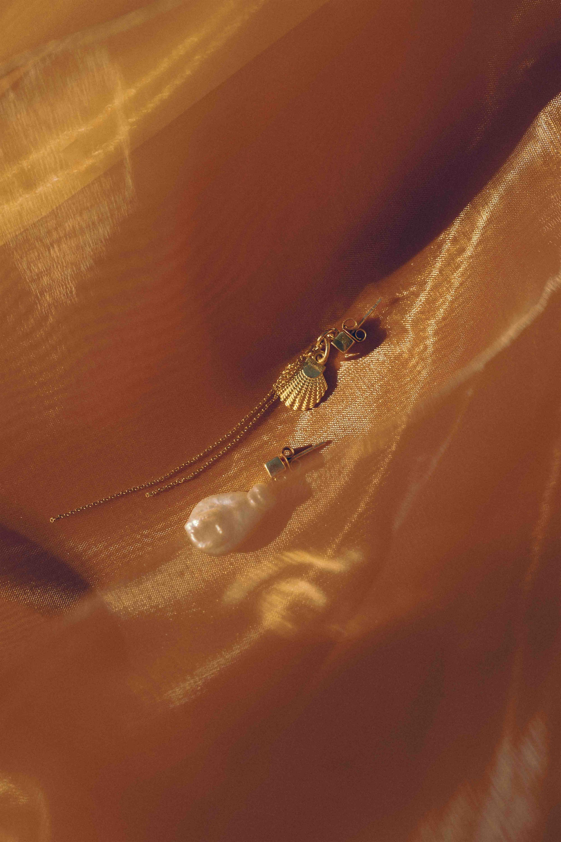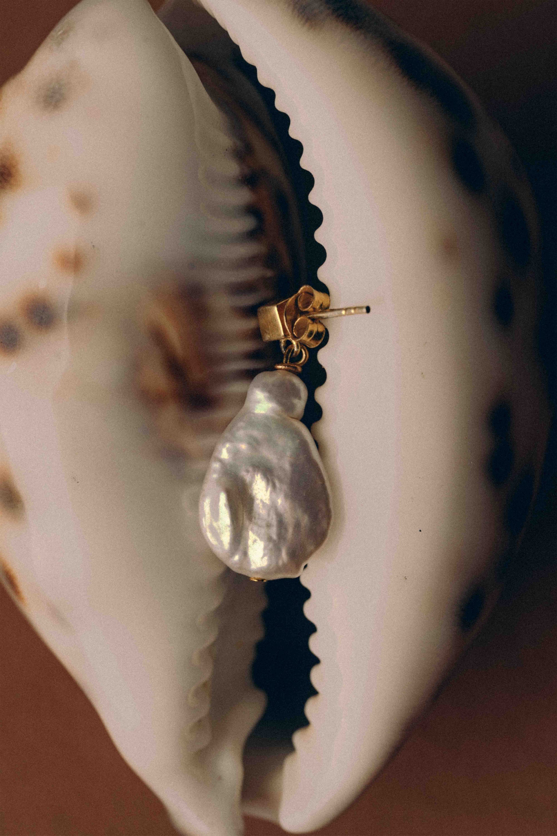 An asymmetric pair combines a flat river pearl and a decorative shell, evoking harmony between the depth of the sea and the golden shimmer of sunlight on its surface.