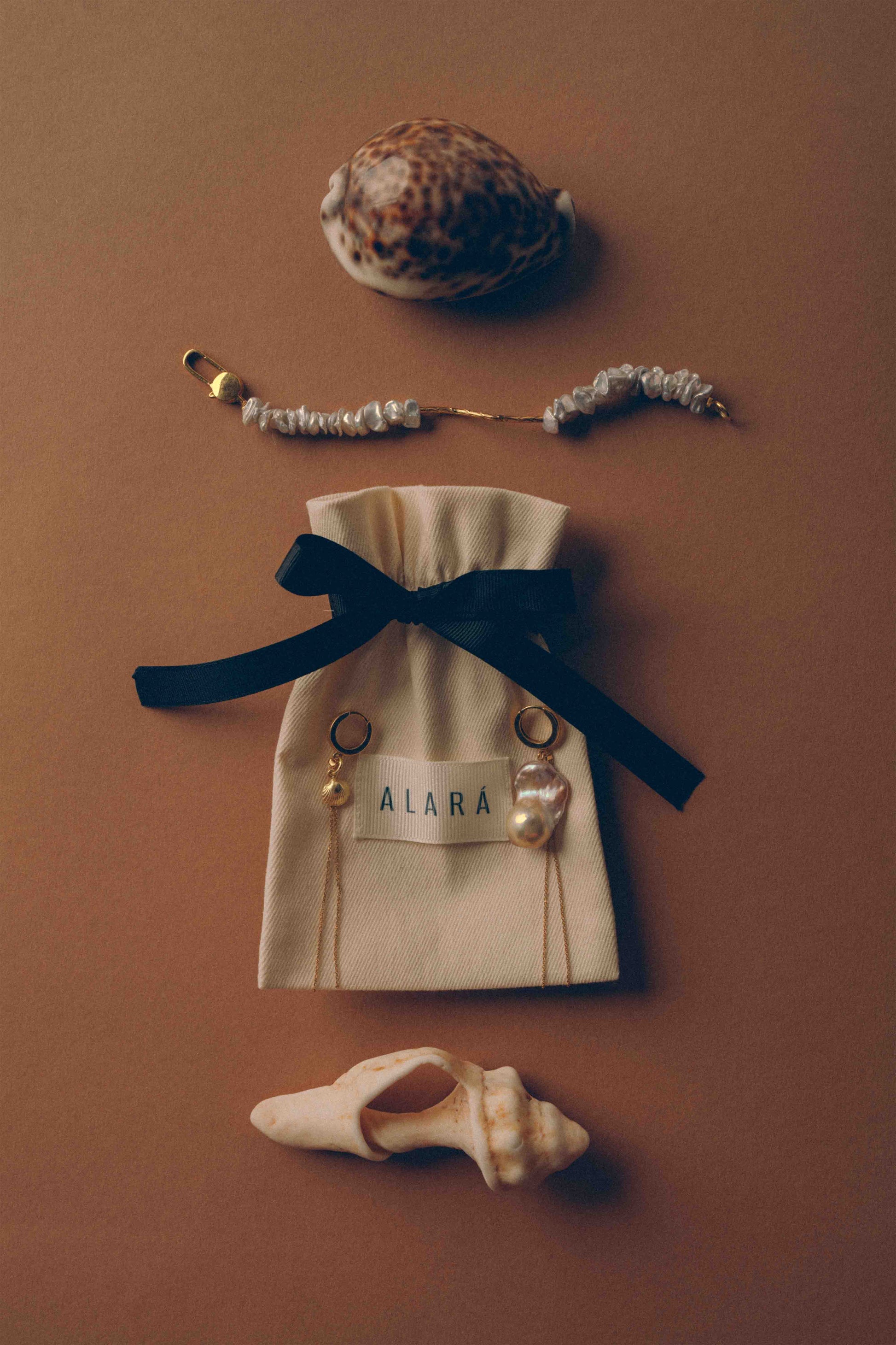 The Éna earrings are an asymmetrical pair that unites natural imperfection and refined elegance — as if shaped by the sea itself.