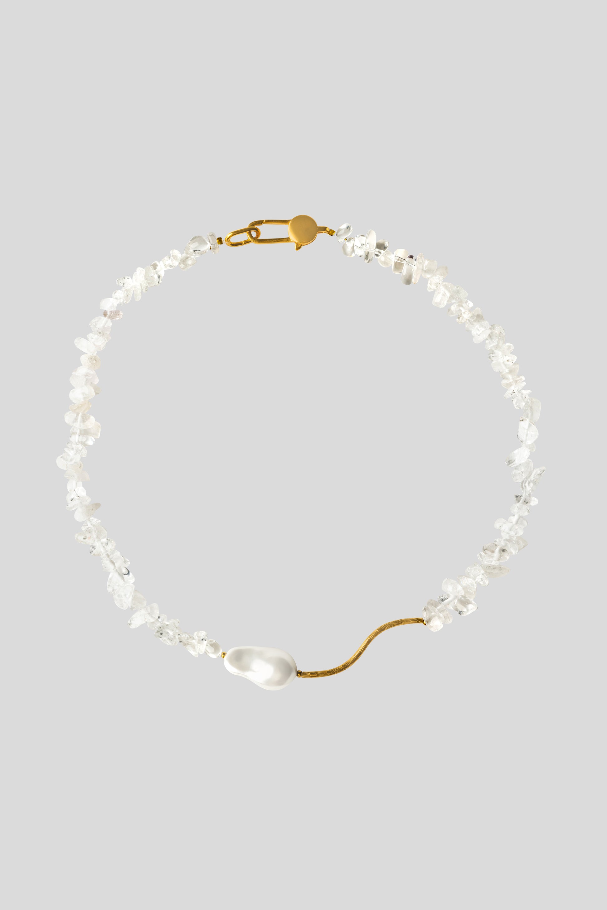 Clear quartz creates a light, almost weightless texture that gently reflects light. The central river shell pearl adds organic asymmetry and a soft, natural glow, while gold-plated hardware brings warmth and sophistication.