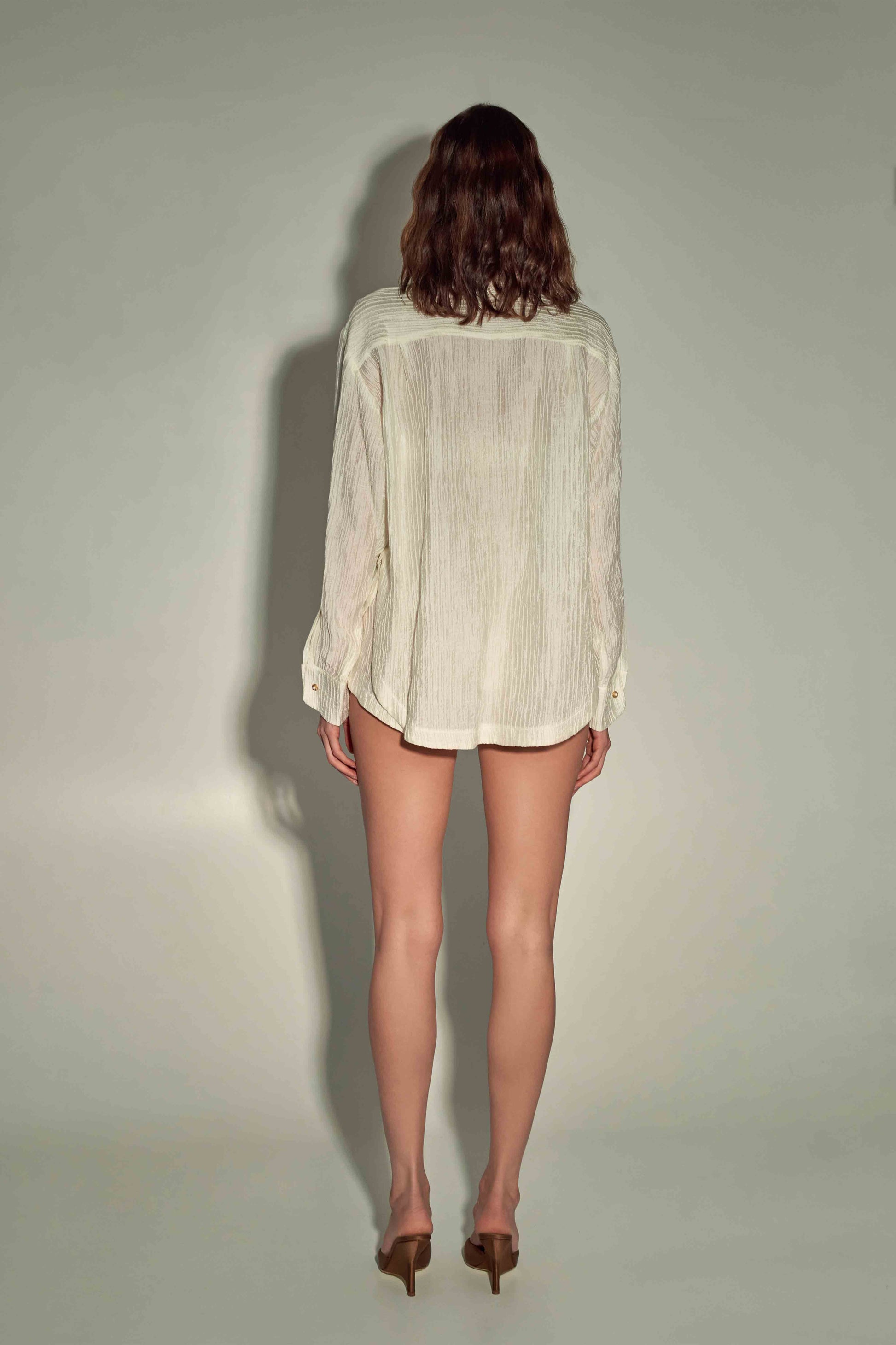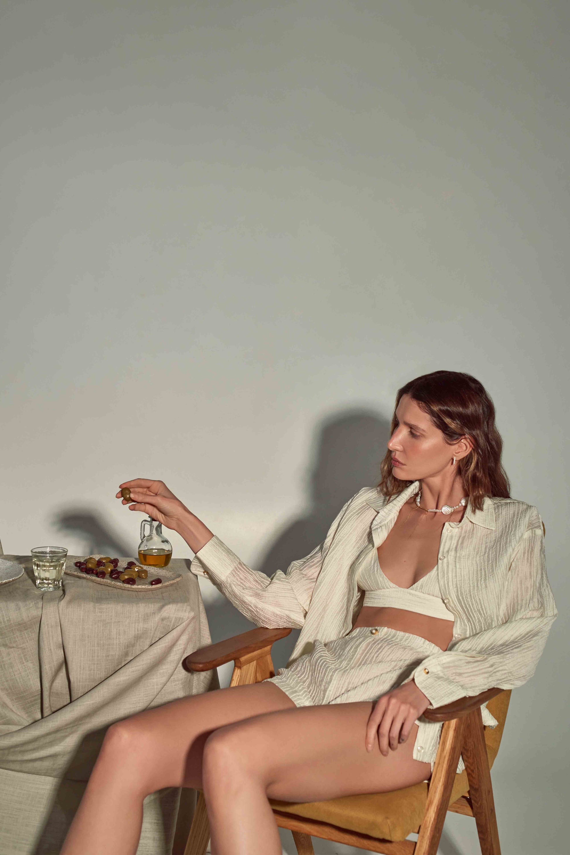 A pearl white shirt from the Evia Collection is a stylish and versatile staple for your resort wardrobe. Crafted from airy, breathable fabric, it ensures comfort even in the heat, while the relaxed fit adds an element of effortless elegance. No ironing needed — it retains its shape perfectly, making it ideal for travel and easy styling. Pair it with matching shorts or trousers from the Evia Collection for chic, coordinated looks — perfect for both daytime strolls and evening outings.