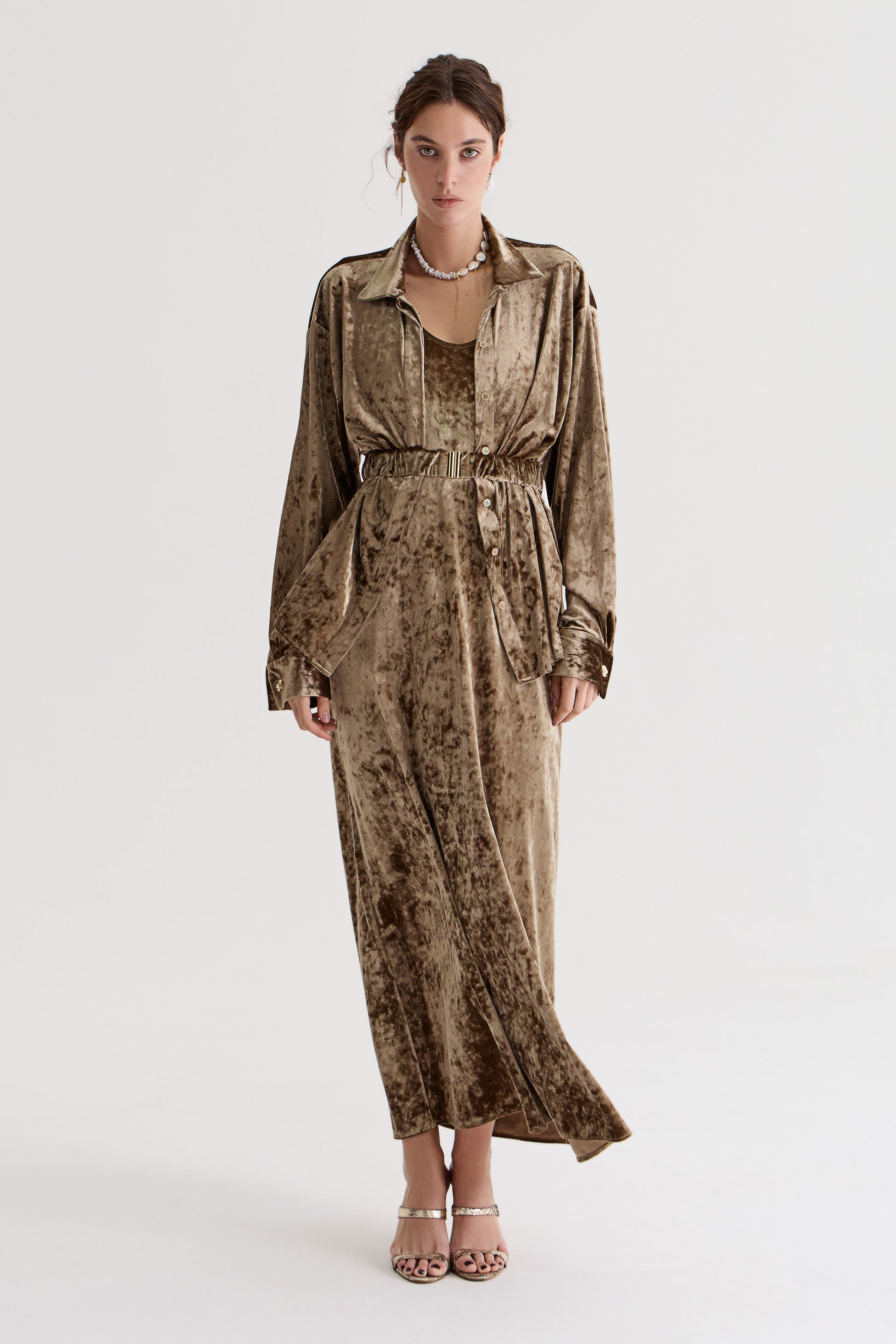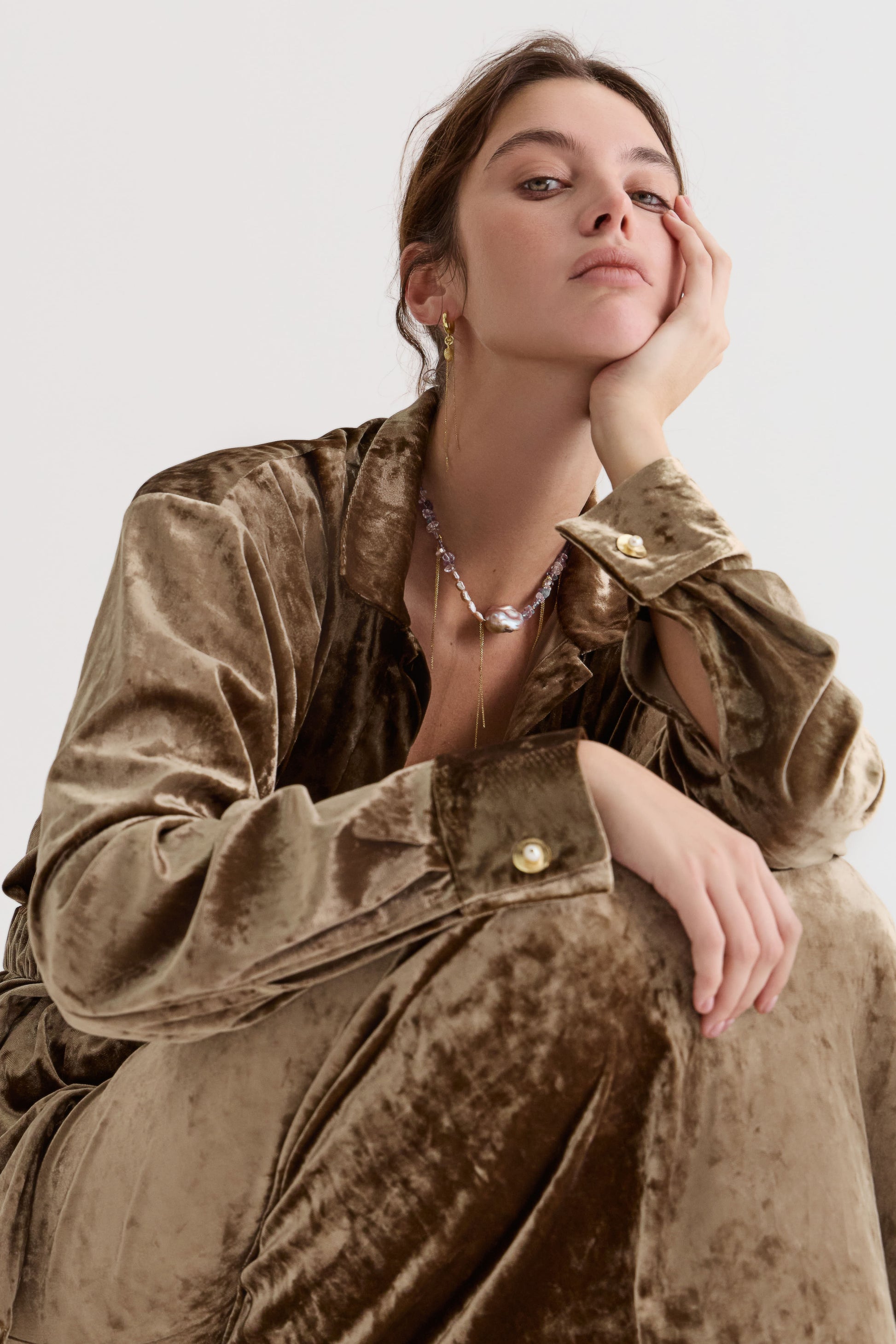 A Siren's Shirt crafted from soft olive velvet — a blend of understated luxury and modern ease.