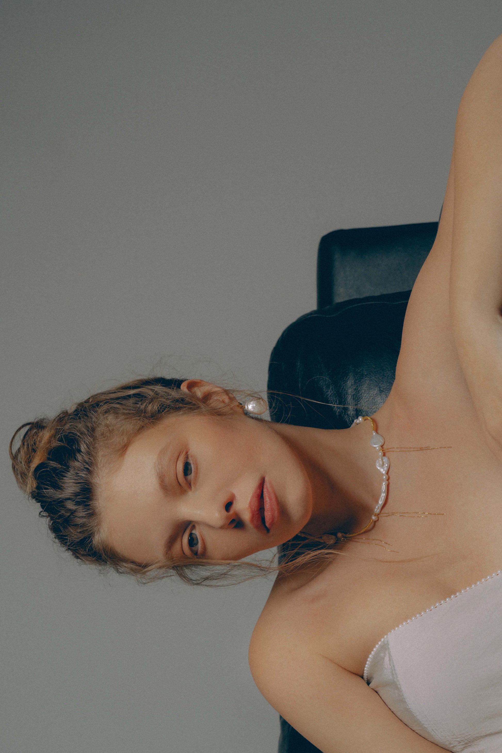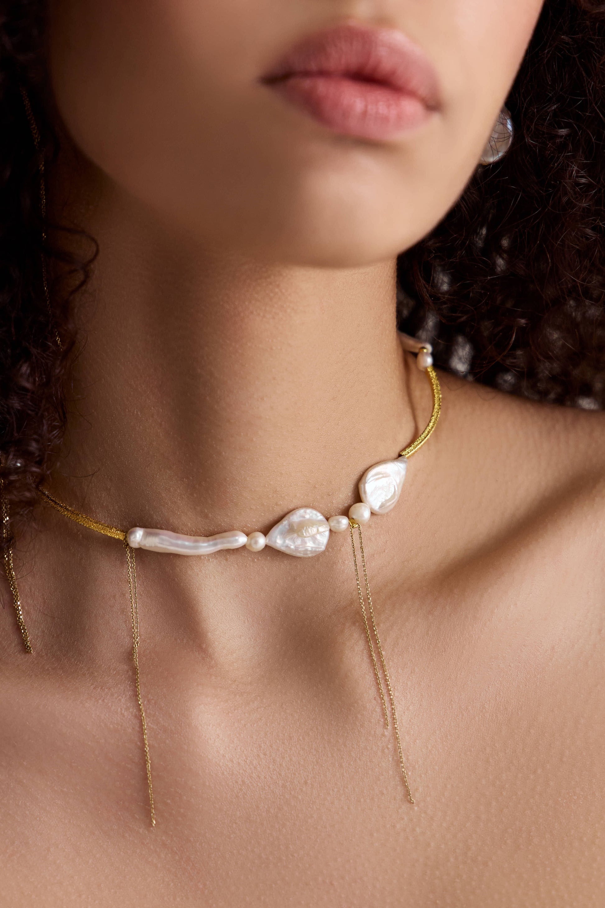 Its asymmetric composition of natural river pearls conveys the sensation of gentle motion — like the echo of the sea upon the skin.