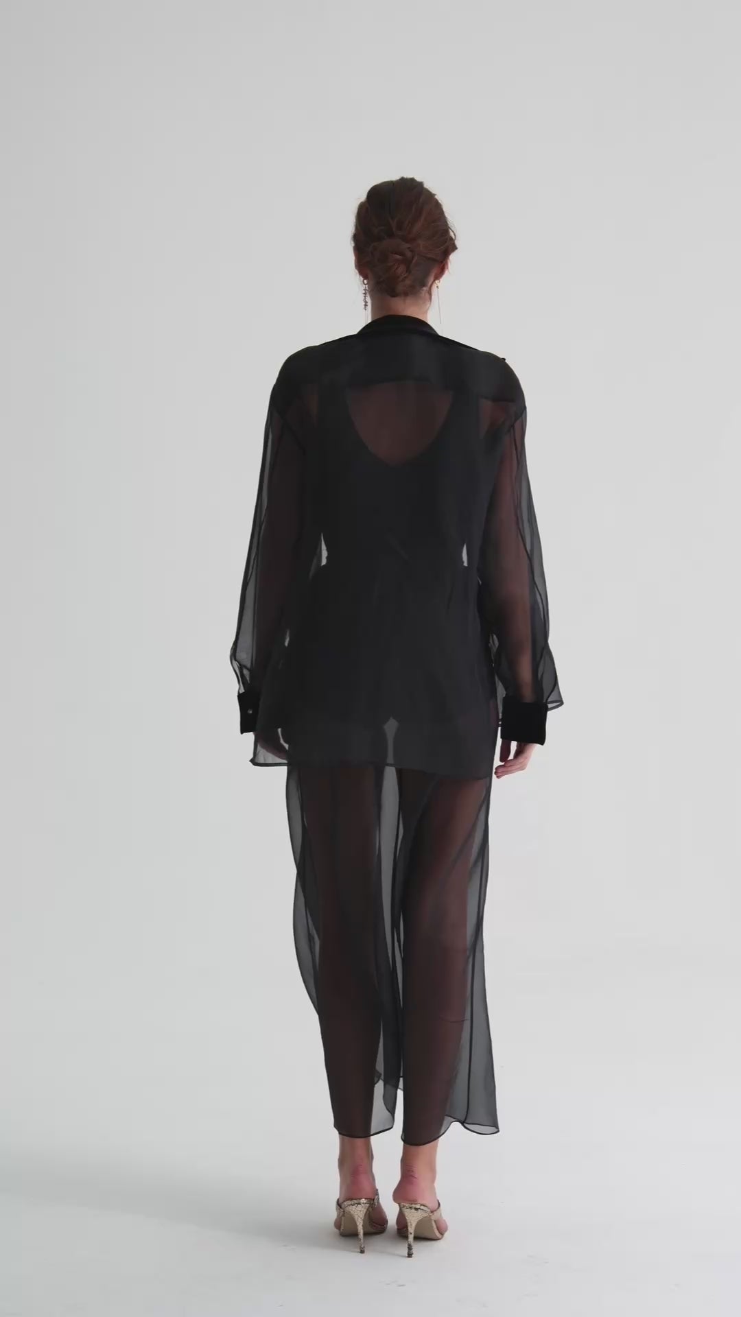 The black velvet mini shorts underneath add depth and textural contrast, leaving an impression of refined openness and subtle allure. Designed with a high waist and a gently flared silhouette that flows gracefully with movement.
