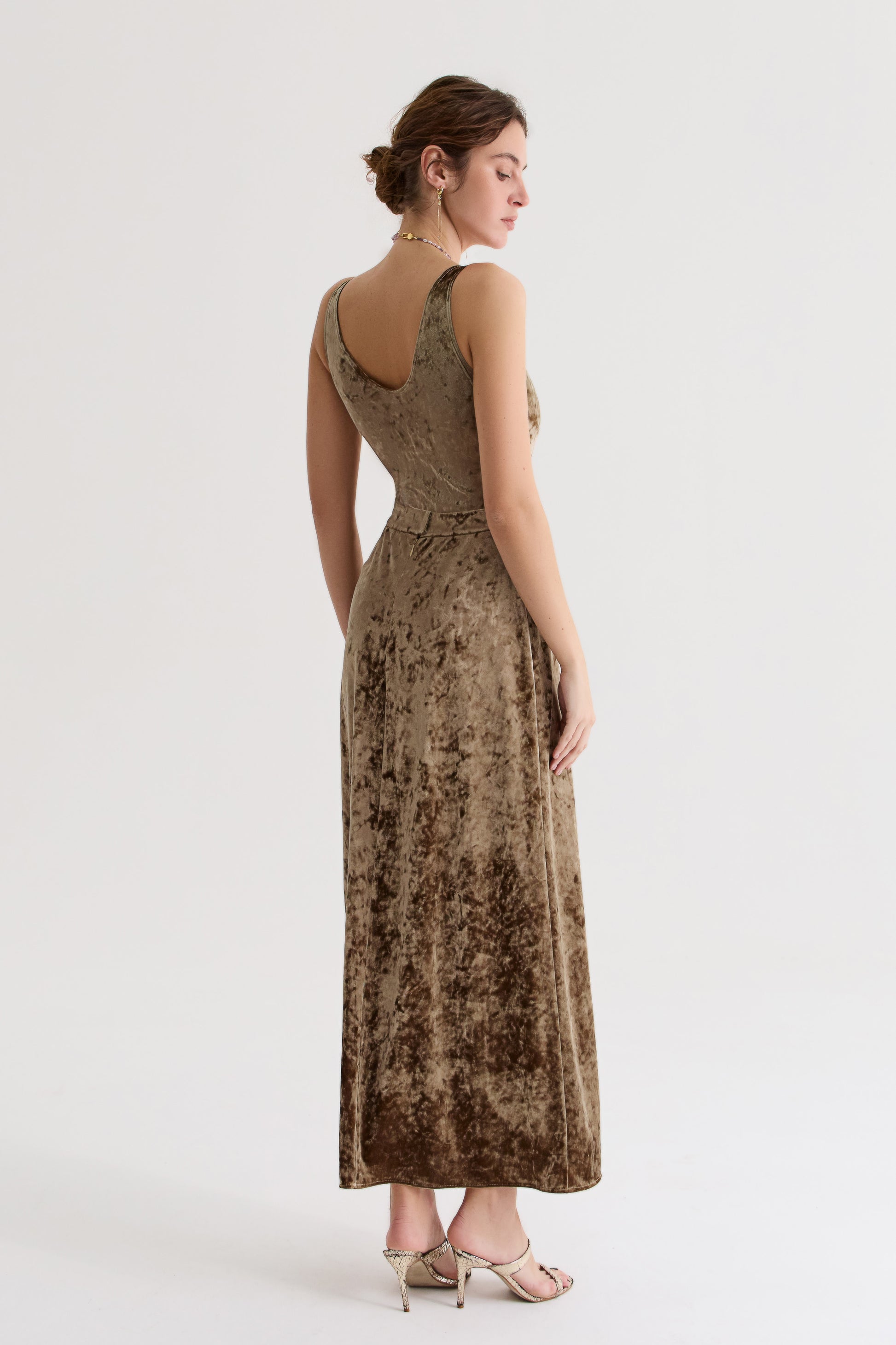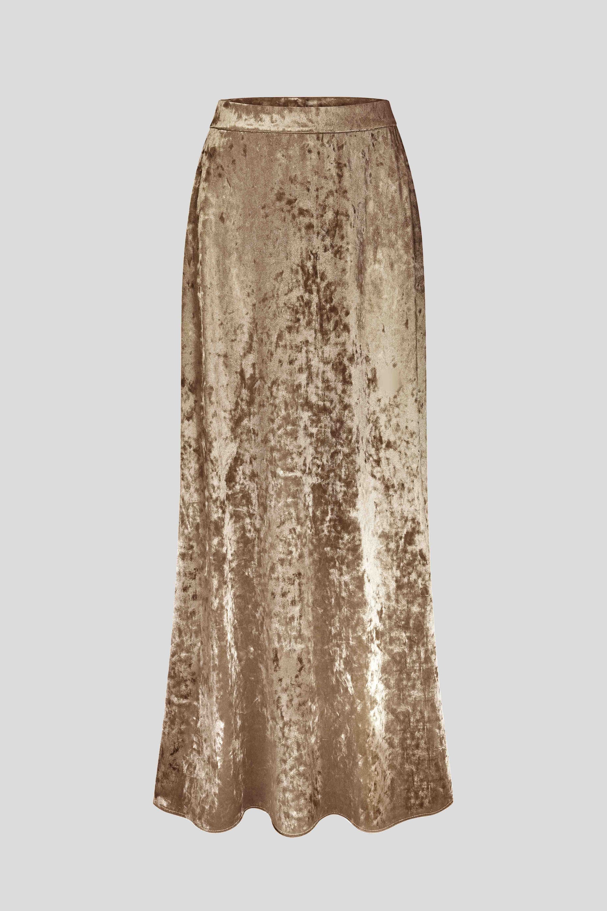 An elegant Siren's Skirt made from soft olive velvet. Designed with a high waist and a gently flared silhouette that flows gracefully with movement.