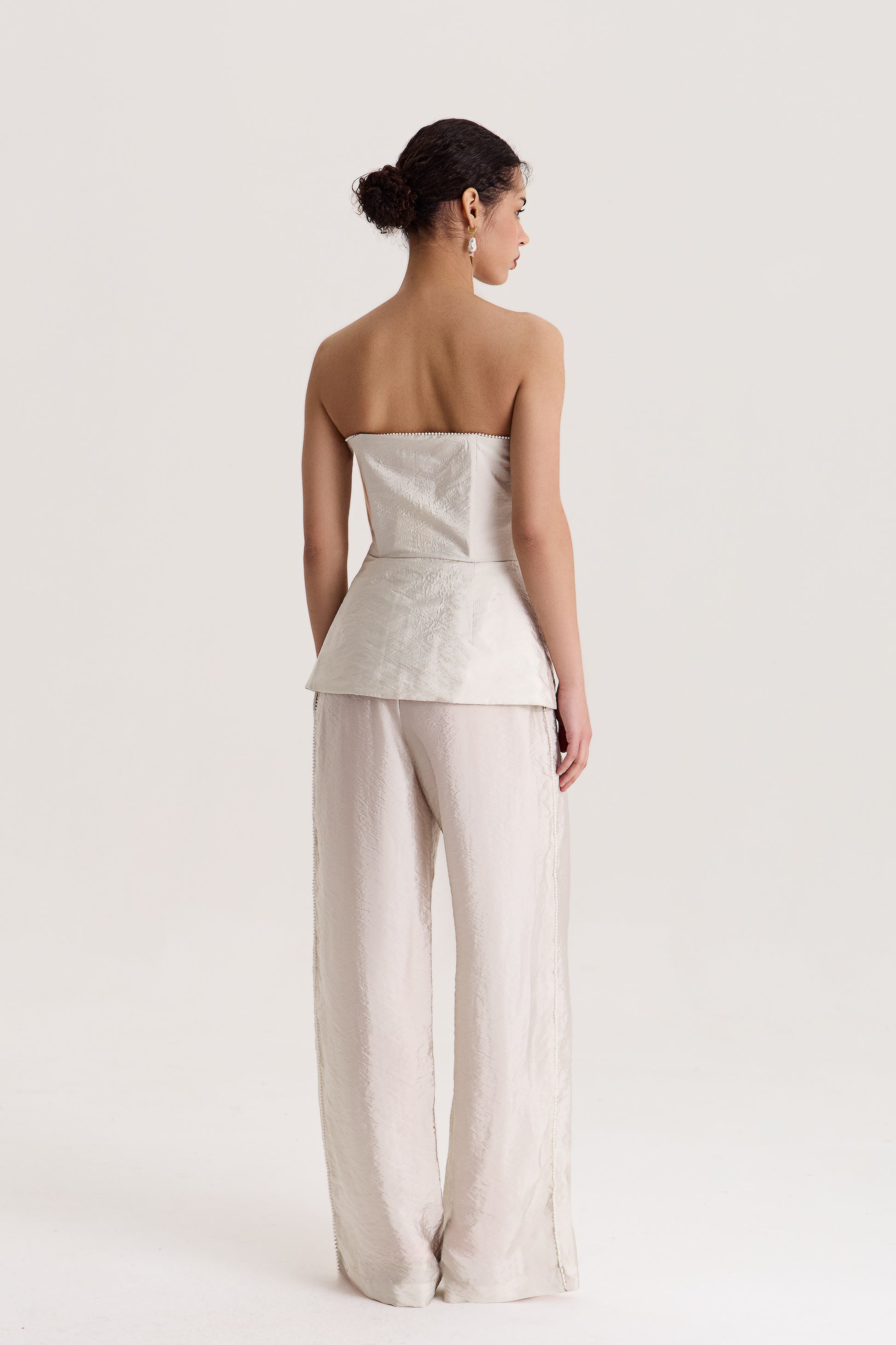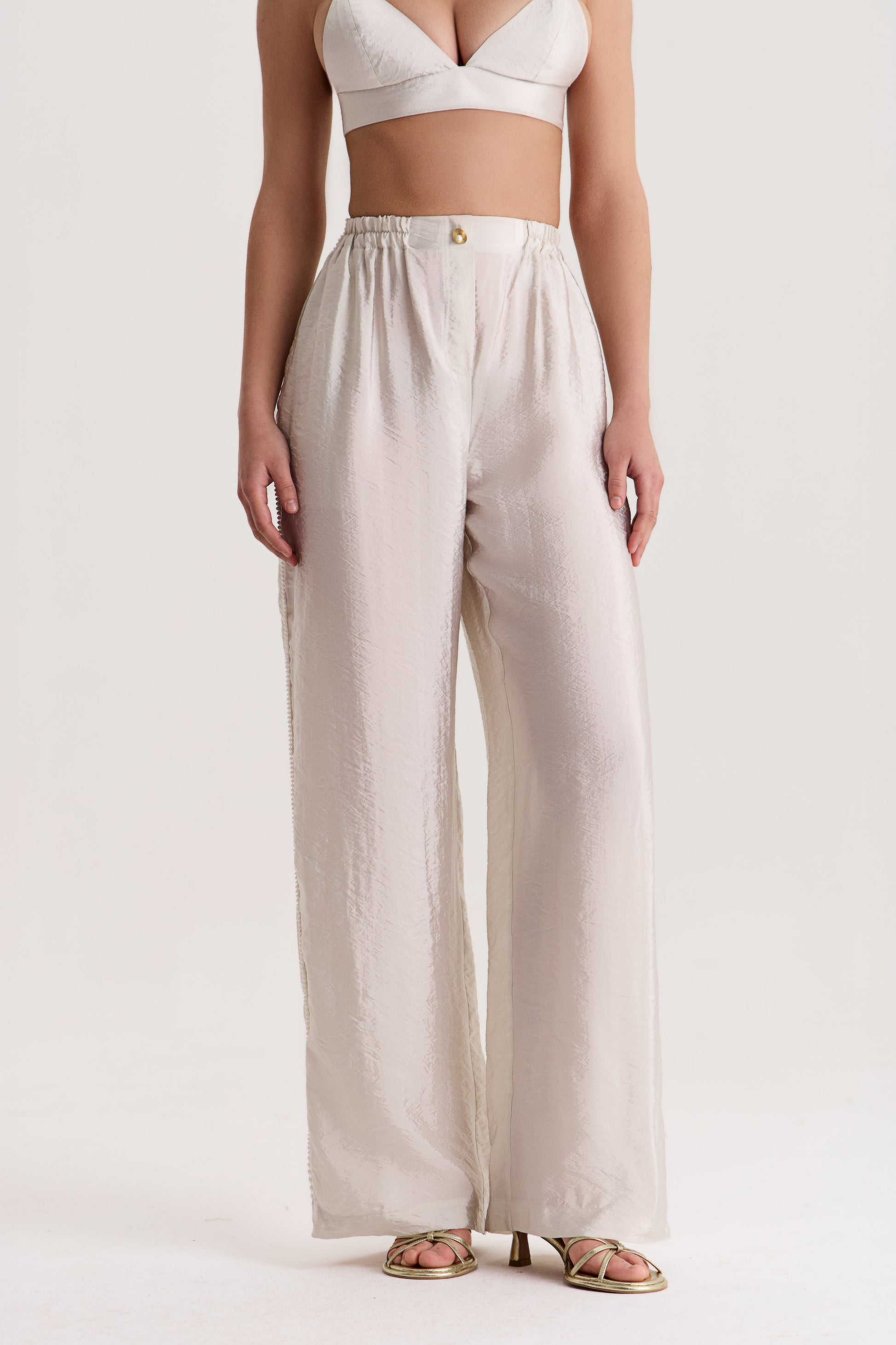 Exquisite palazzo trousers from the Delos Breeze collection, featuring decorative bead embellishments along the side seams. The fluid silhouette provides freedom of movement, while the refined details add a graphic touch and dynamic elegance. An ideal choice for evening occasions or a sophisticated cocktail look.