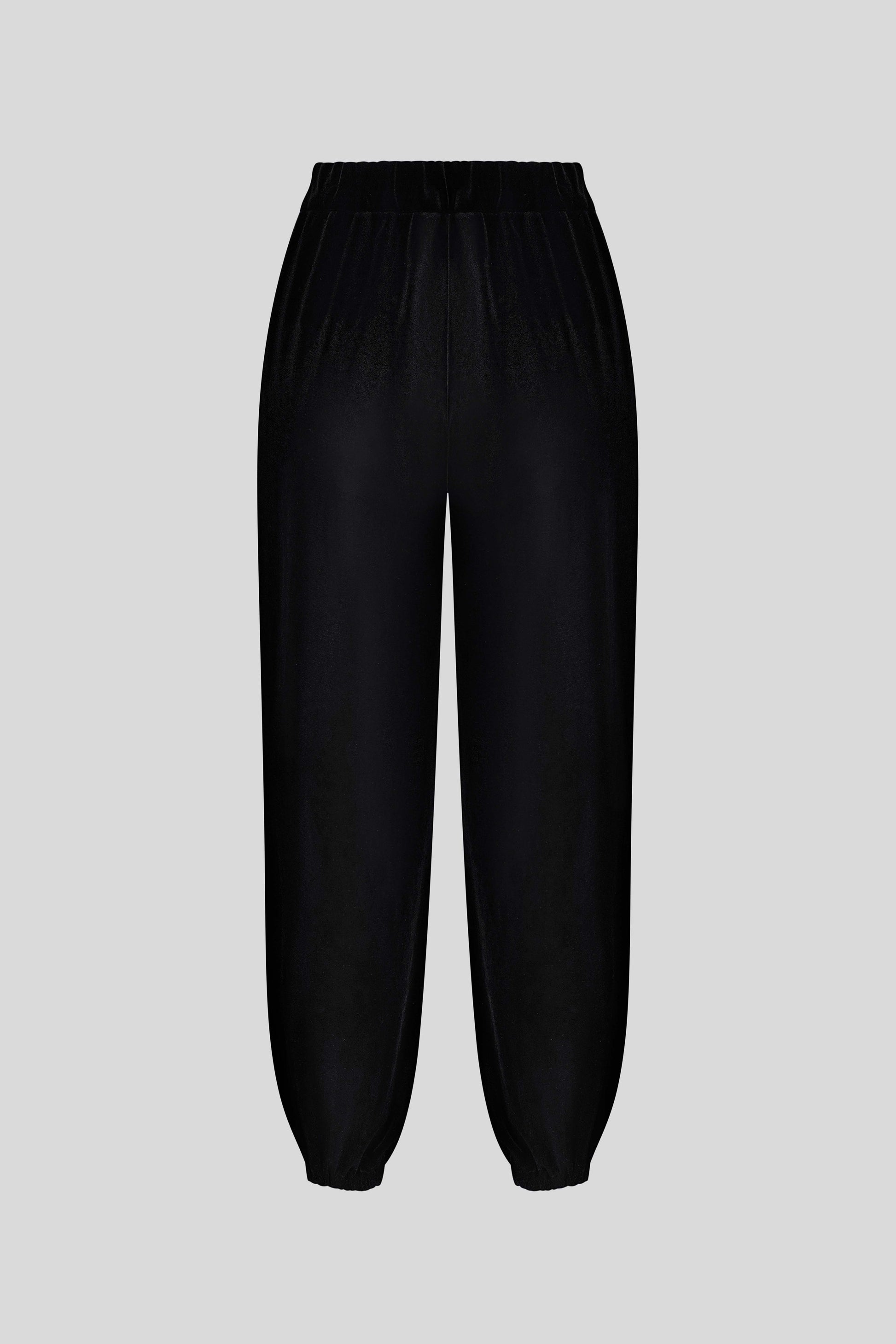 Featuring a high-rise waist and elastic cuffs, the silhouette flatters the body while maintaining lightness and fluidity of movement.