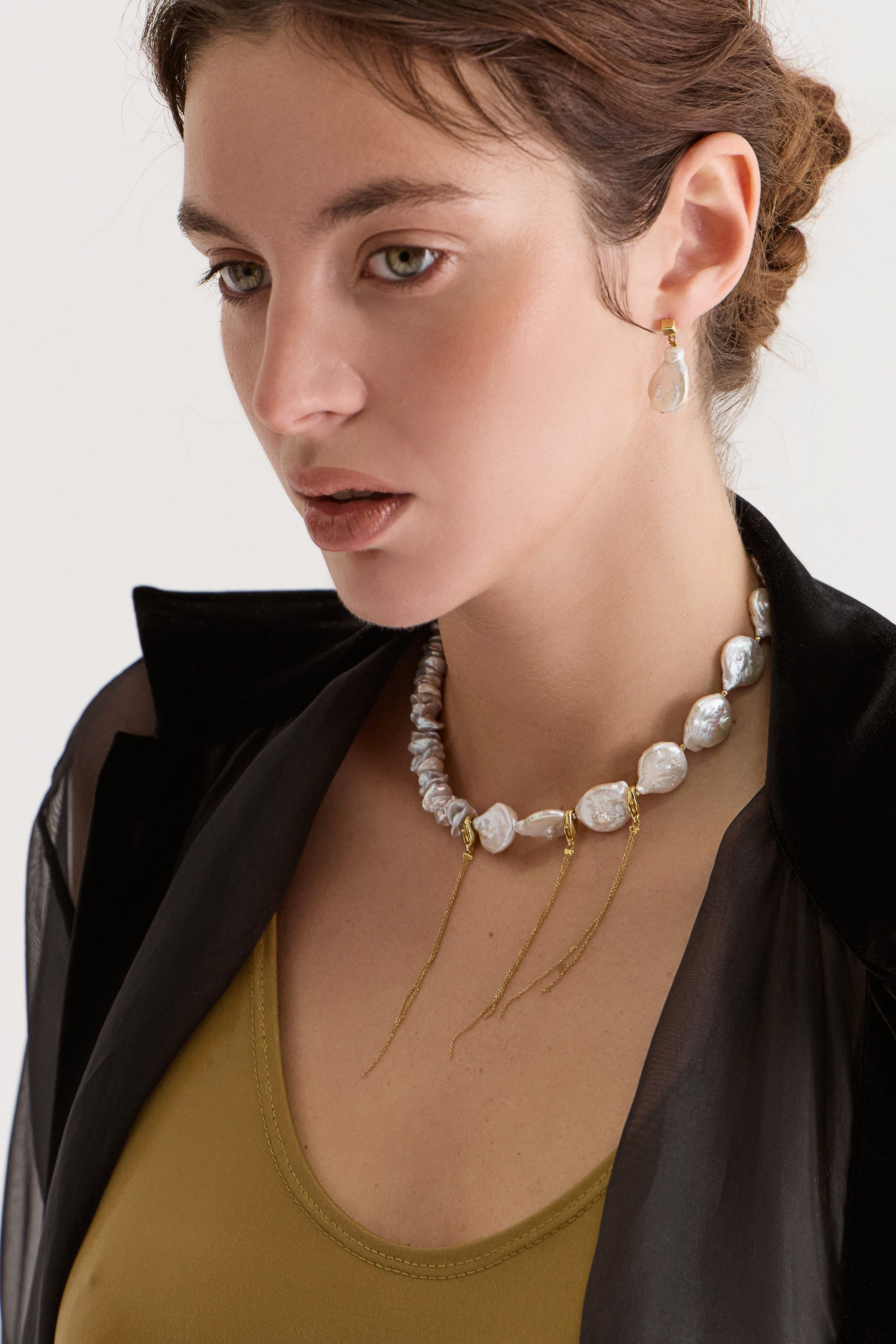 Білі перлини віддзеркалюють м’яке світло, а сіруваті додають глибини — як тінь у воді під час заходу сонця. Асиметрія та плавні ланцюжки створюють ефект руху, у якому кожен елемент звучить по-своєму — разом утворюючи гармонійне echó природи.
