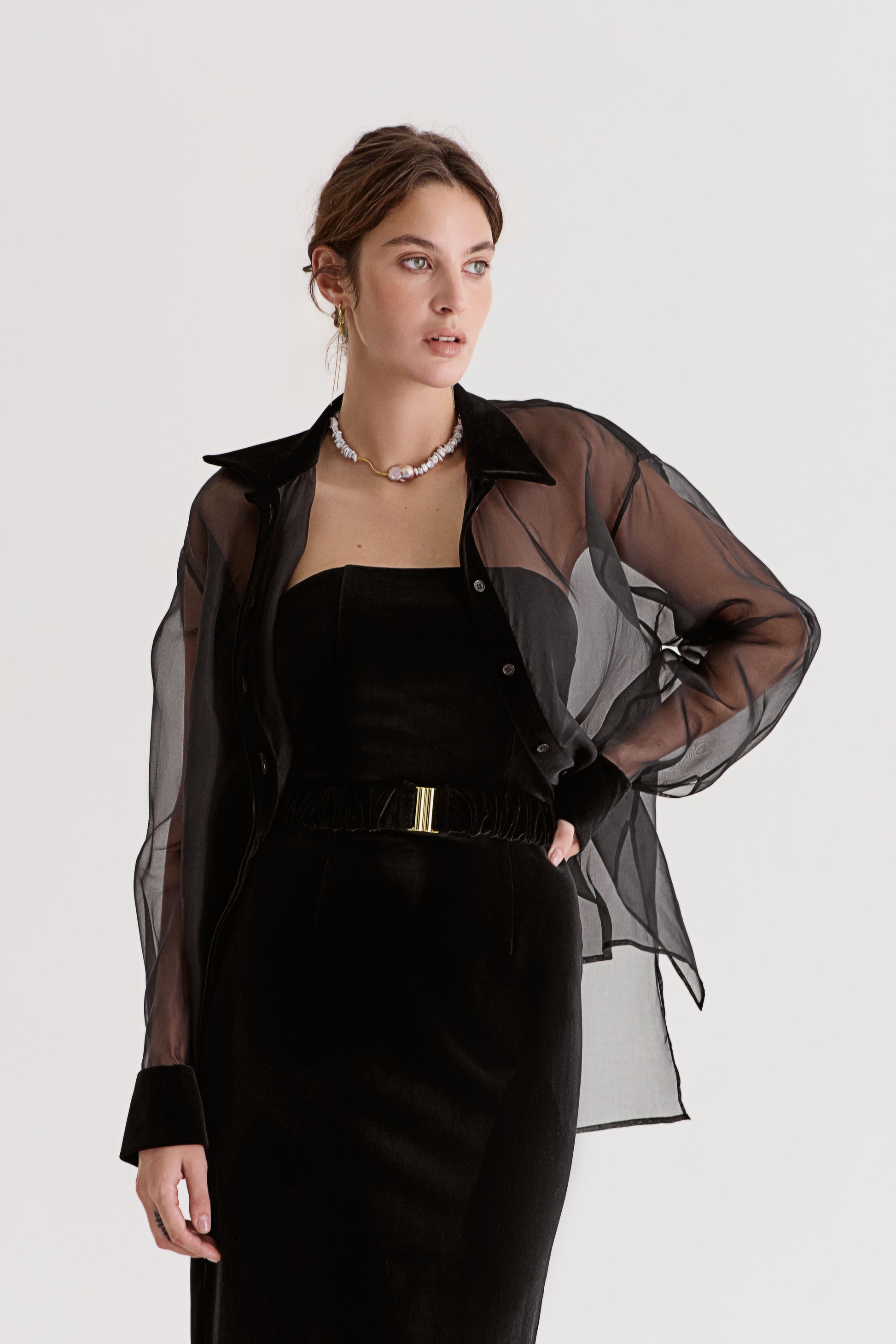 Його форма мінімалістична, але наповнена живою енергією: ніжно-сірі річкові перли створюють м’яку фактуру хвиль, а центральна барокова перлина з перламутровим сяйвом відбиває світло, ніби перша іскра сонця на воді.